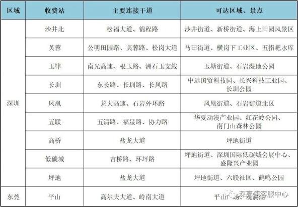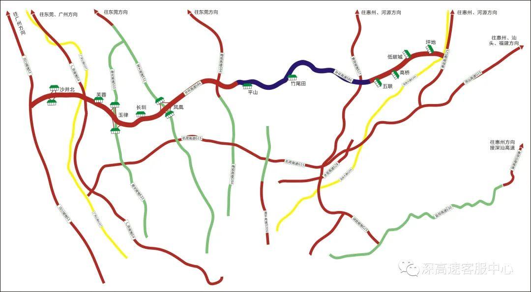 ▲ 沙井北立交设管理中心1处(长圳),收费站9处(沙井北、芙蓉、玉律、长圳、凤凰、五联、高桥、低碳城、坪地收费站),停车区1处(长圳)。