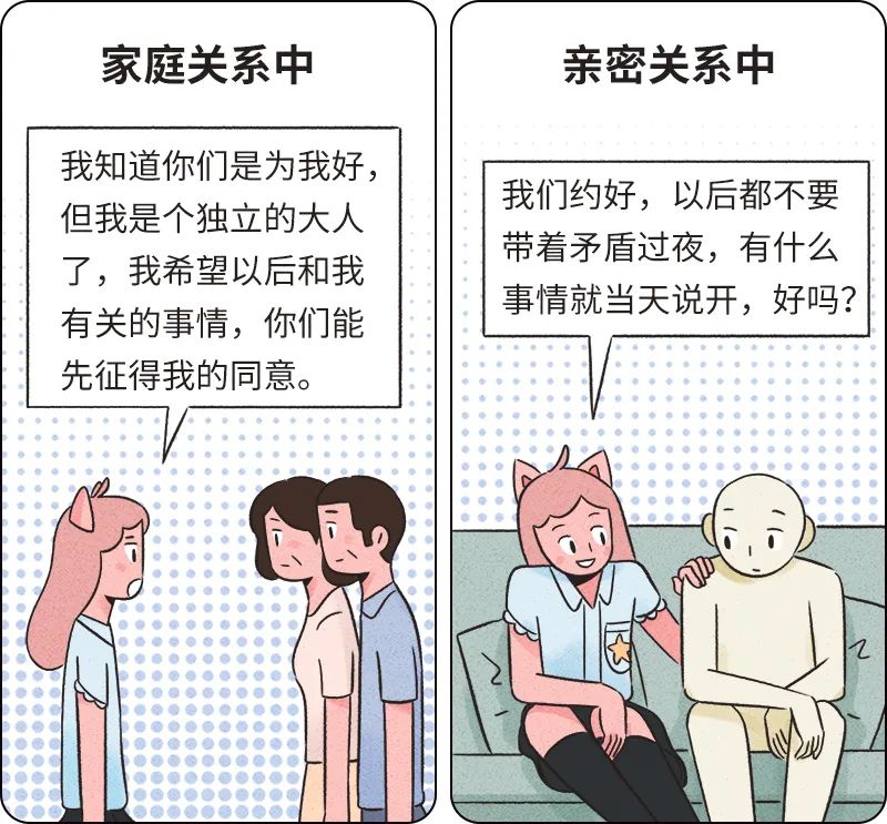 用“我”的句式能够展示主权,表示你的拒绝是在为自己的感觉和想法负责,而非攻击他人。而且,当你思考如何用“我”来表达时,已经完成了对自己的感觉、想法的识别。