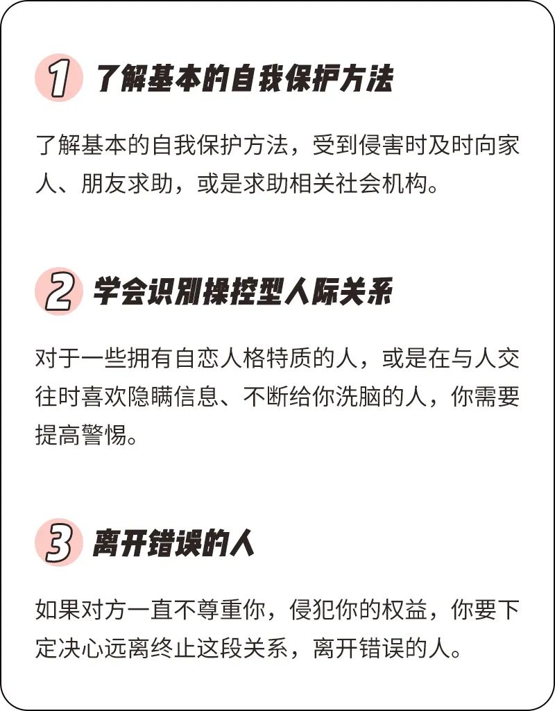 每次说了“不”后都给自己正向鼓励,不论是内心的积极自我对话、夸自己“做得好”,或是给自己物质奖励,帮助自己强化尊重自我的概念。最后,面对侵犯了你的权益,让你感到不舒服或造成了实际伤害的人和事,要维持愤怒和不容忍,并学会有效地保护自己。