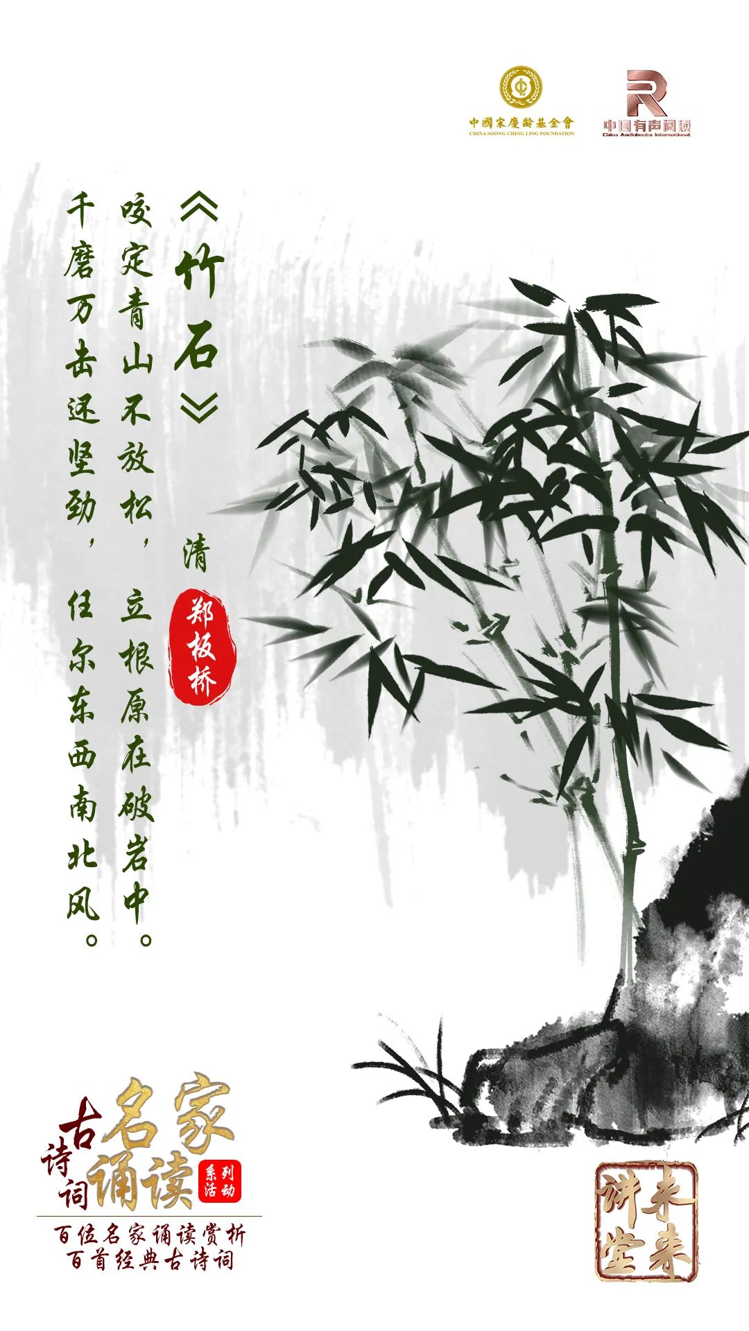 中国宋庆龄基金会、中国广播电视社会组织联合会有声阅读委员会携手推出“未来讲堂”古诗词名家诵读系列活动,邀请百位名家诵读赏析百首经典古诗词,把最经典的古诗词与最优美的声音有机结合,让广大青少年感受古诗词的力量与芬芳,在吟诵鉴赏中志存高远、陶冶情操。让我们传承经典,引领未来!今天,由演播艺术家杨佩琴老师为大家诵读和赏析的是清代诗人郑板桥的作品《竹石》。