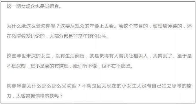 讲身材羞辱:“我特别羡慕超模,因为她们足够平,她们的身材就是一种态度:对男人的不屑一顾……”“她们好像在说:你看什么看?你越喜欢什么,老娘就越不长什么。”