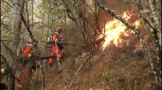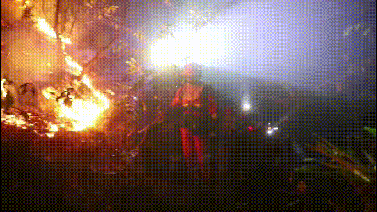 截止今早9点火势呈地表火伴随着树冠火燃烧
