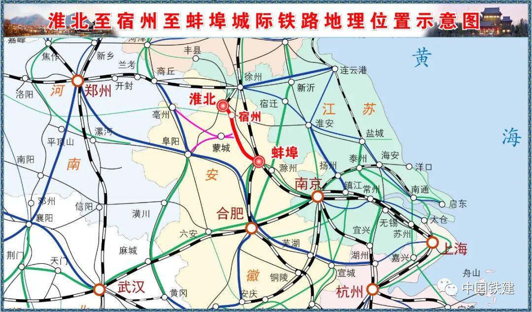 淮宿蚌城际铁路地理位置图淮宿蚌城际铁路由上海院总体设计,铁四院、中铁十二局集团等单位参建。新建正线全长约162.2公里,设计时速350公里,全线设6座车站,总投资约249.5亿元。