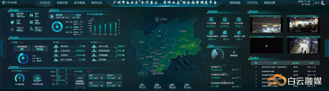 城市运行治理实现“一屏通观”作为广州人口最多的行政区、面积最大的中心城区,白云区辖内业态繁复各异,如何实时掌握城市脉搏跳动,监测城市运行态势,如何及时高效响应群众诉求,保障各类城市治理事项得到快速响应和有效处理,成为了建设智慧白云的“拦路虎”。