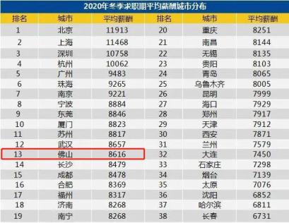 近日,智联招聘发布《2020年冬季佛山雇主需求与白领人才供给报告》。数据显示,佛山地区2020年冬季求职期的平均薪酬为8616元/月,较上季度上升4.1%,且同比小幅上涨0.6%,在全国38个主要城市的薪酬水平中排名第13位,环比上升一个名次。