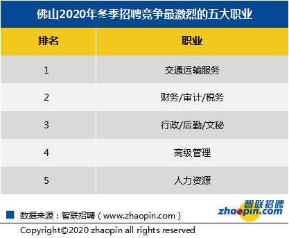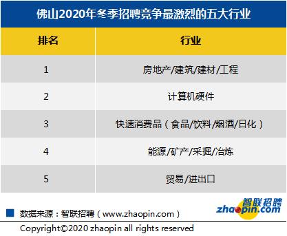 报告显示,佛山2020年冬季招聘竞争最激烈的五大行业为:房地产/建筑/建材/工程、计算机硬件、快速消费品(食品/饮料/烟酒/日化)、能源/矿产/采掘/冶炼、贸易/进出口。竞争最激烈的五大职业是交通运输服务、财务/审计/税务、行政/后勤/文秘、高级管理、人力资源。