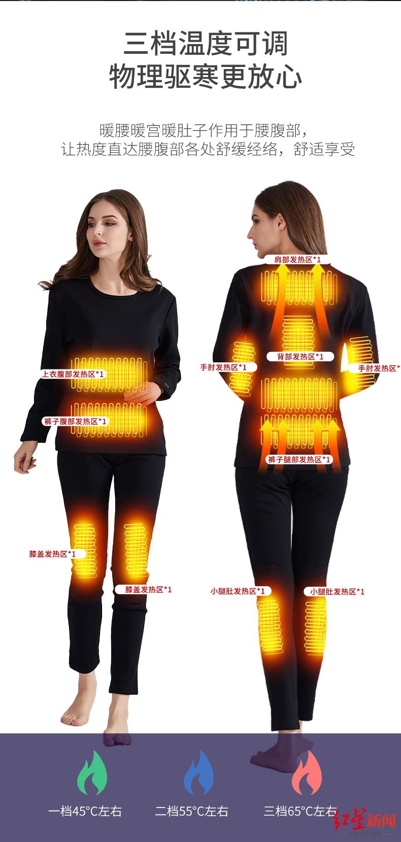 红星新闻了解到,这样的发热保暖衣在市面上售价从100余元到600余元不等,充电接口电压都在人体安全电压以下,没有被“电”的风险。但是,30秒发热至50℃以上、保暖衣可以被加热到60℃以上……使得这款充电保暖衣有着“低温烫伤”的危险。