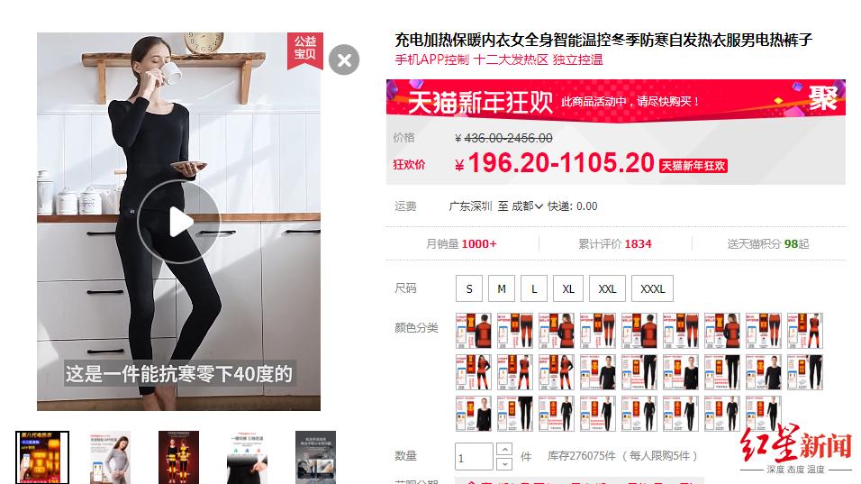 在网络销售平台上,搜索关键词“充电保暖衣”“电热内衣”,可以找到类似款的保暖衣。有的商家直接打出“李某同款”的字样,售价从100余元到600余元不等。