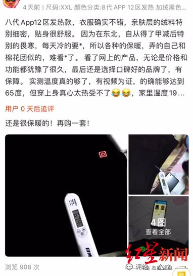 在买过的网友晒出的图片显示,调节按钮后这样的充电保暖衣确实可以被加热到65度,网友放一旁的温度计显示温度为67.4度,“ 实测温度真的够了,有视频为证,的确能够达到65度,但穿上身真心太热受不了。”