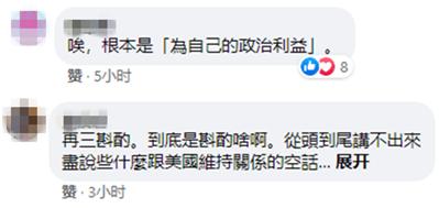 蔡英文的说法也引来网友的批评,有网友在脸书留言称,“根本是为自己的政治利益”、“到底斟酌啥,从头到尾讲不出来”。