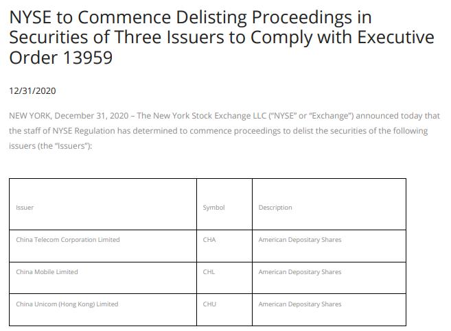 就在行政命令生效前夕,当地时间2020年12月31日,纽交所宣布,将对中国移动有限公司、中国电信股份有限公司、中国联通(香港)有限公司进行退市处理。根据交易所的声明,三家公司将在1月7日至1月11日期间退市。