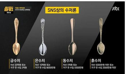 随着韩国阶级上升越来越难,韩国网友据此创造出了“汤匙阶级论”。根据父母的经济状况和地位,将不同阶级分别称为金,银,铜,土汤匙。韩国综艺节目《舌战》总结过韩国网友们对金、银、铜、土汤匙的具体定义。