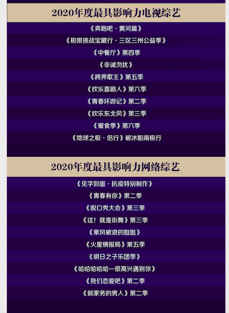其中,《脱口秀大会》第三季跻身最具影响力的网络综艺的同时,也与《舞蹈风暴》第二季等共同跻身最具影响力内容营销案例。浙江卫视则获得2020年度最具创新力综艺平台。另外,2020年的文化类综艺也持续被关注,《见字如面·抗疫特别制作》《跨界新文创》《还有诗和远方》《我在颐和园等你》《国学大典》等获最具影响力综艺或最具引导力节目。