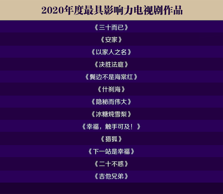 在诸多变化中,现实题材依旧是中国电视剧创作的主流和主导,《三十而已》、《安家》等现实题材作品在去年一度创造了诸多话题。相比2019年,2020年共上线网剧268部,呈现出爱优腾芒在差异化竞争中的抱团发力;悬疑剧、甜宠剧“打败”古装剧成为新的现象级作品“大本营”;IP剧、翻拍剧虽受追捧但遭遇发展瓶颈;主旋律作品比重提升;网剧参与各大奖项评选并获得佳绩等新特点和新趋势。