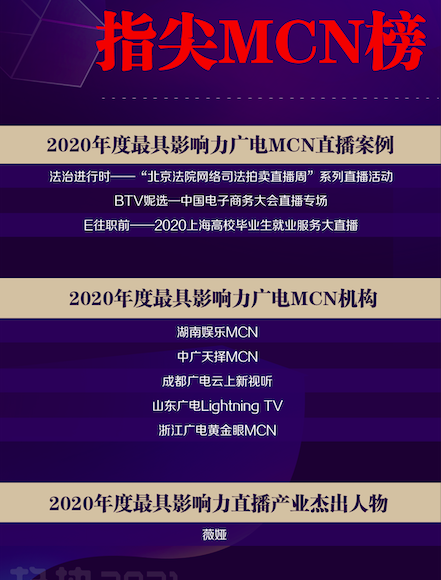 本次论坛也发布了“2020指尖MCN榜”:奖项包括“2020年度最具影响力广电MCN直播案例”、“2020年度最具影响力广电MCN机构”等,其中湖南娱乐MCN、中广天择MCN、成都广电云上新视听等机构榜上有名。薇娅也获得“2020年度最具影响力直播产业杰出人物”。