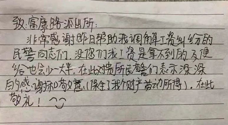 致:富康路派出所非常感谢昨日帮助我调解工资纠纷的民警同志们,没您们我工资是拿不到的,即便给也会少一大半。在此对贵所民警们表示深深的感谢和敬意(保全了我个人劳动所得财产)。在此,敬礼!