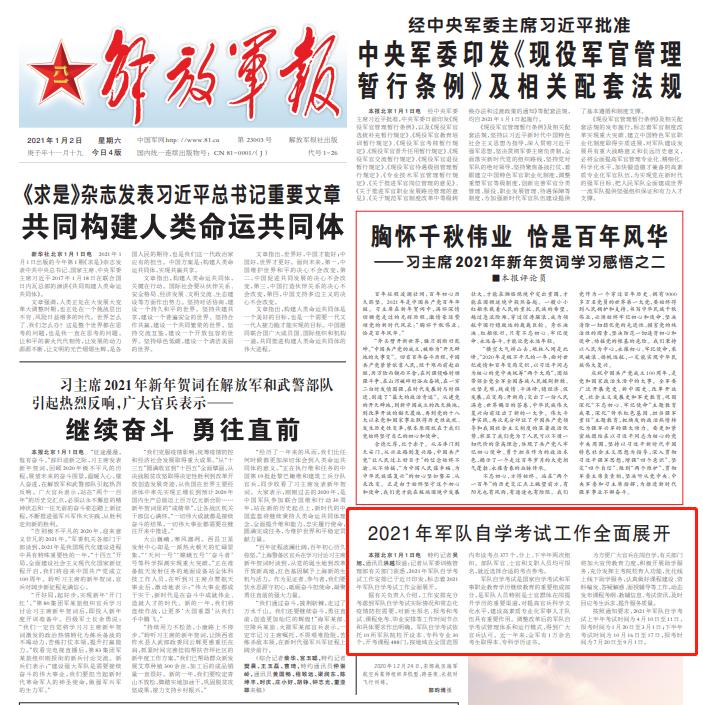 ▲2021年1月2日,《解放军报》一版报道了这个消息作为现役军人,暂时没有学历方面的限制,如果能够未雨绸缪,提前在部队解决好学历提升问题,等退役之后,不管是找工作、在单位落编、晋职提升,都有相当的便利和好处!