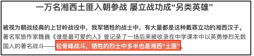 近几年,“湘西土匪”还跟抗美援朝扯上了关系。有一些文章称,曾有上万名“湘西土匪”作为没有军籍的“随军劳改犯”前往朝鲜战场,去完成“自我救赎”,其中绝大多数人长眠在异国的土地上,侥幸生还者后半生也备受歧视,凄苦终老。