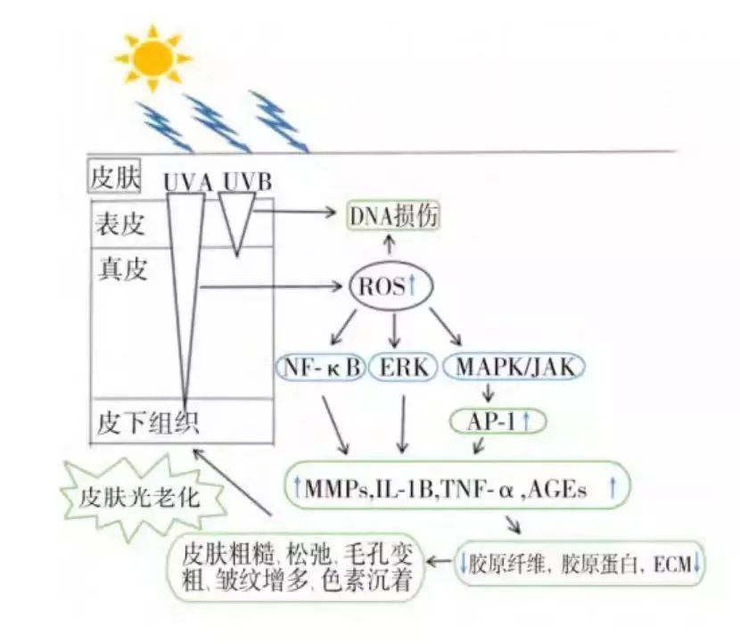 紫外线照射引起的皮肤光老化的损伤机制见下图: