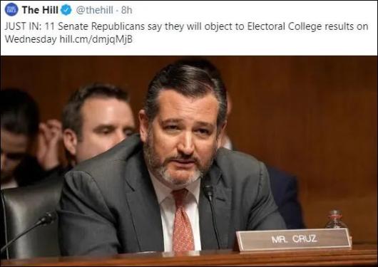 据《国会山报》报道,当地时间1月2日,美国共和党参议员泰德·克鲁兹(Ted Cruz)、罗恩·约翰逊(Ron Johnson)等11名共和党参议员联合发表声明,宣称他们将在1月6日反对选举人团的投票结果,除非国会对投票结果进行为期10天的紧急审核。