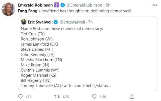 推特截图 下同1月3日,斯沃韦尔发推公开抨击11名计划反对大选结果的共和党人,称这些人是“民主的敌人”。