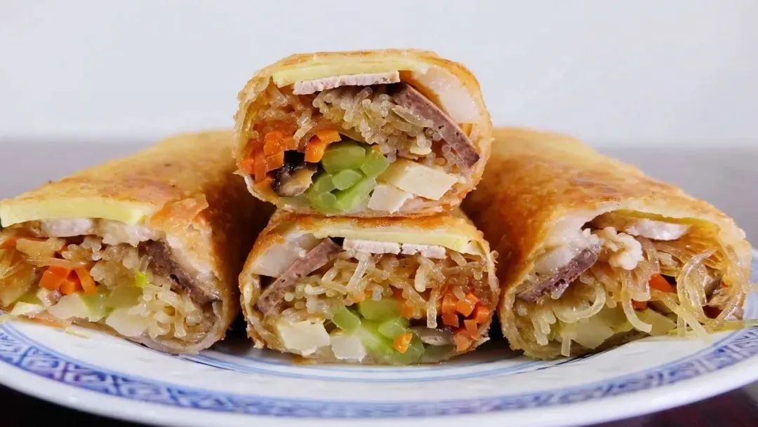 一张饼皮卷入猪肉、猪肝、鸡蛋、胡萝卜、粉丝、香菇、莴笋、荸荠、豆干等家常菜,再煎得又香又脆,皮薄、馅香,饺饼筒是每一个在外漂泊的天台人的念想。