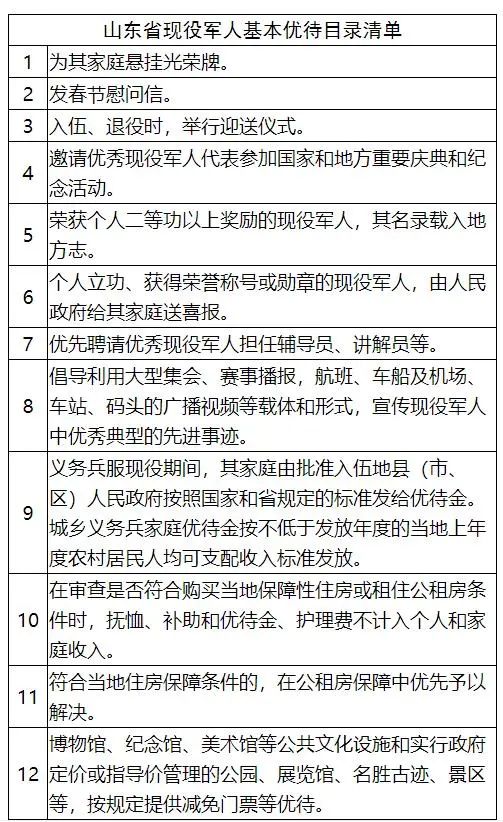这些清单涵盖优抚对象荣誉激励、生活保障、养老服务、医疗住房、退役安置、就业创业、教育培训等各个方面。同时,山东正在逐步实行全国统一制发、统一编号的优待证,作为享受相应优待的有效凭证。据悉,山东省现役军人基本优待目录清单包括为其家庭悬挂光荣牌、发春节慰问信、邀请优秀现役军人代表参加国家和地方重要庆典和纪念活动等18项内容。