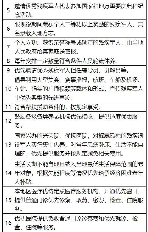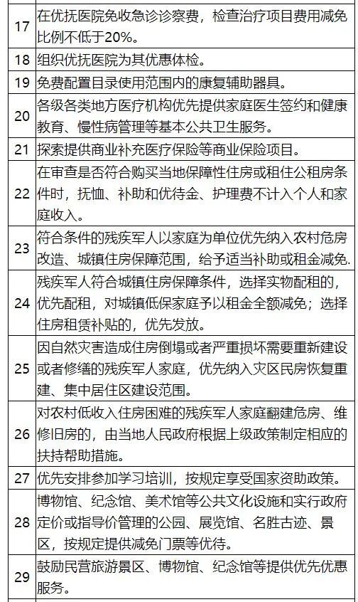 残疾军人基本优待目录清单包括优秀人员参加“最美退役军人”评选表彰、每年安排一定数量符合条件人员轮流休养、免费配置目录使用范围内的康复辅助器具等36项内容。