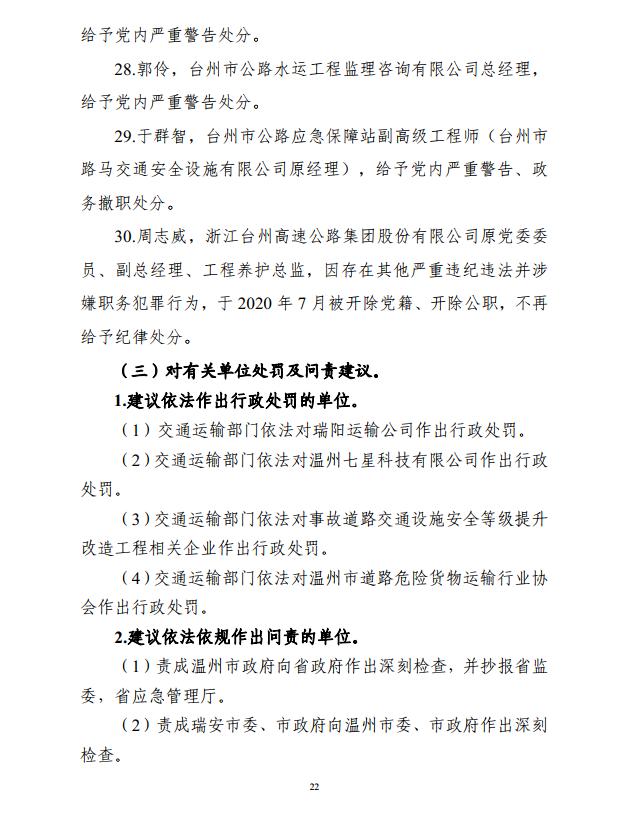 对于在事故调查过程中发现的地方党委政府及有关部门等公职人员在履职方面存在的问题,浙江省纪委省监委依规依纪依法组织开展审查调查,对30名责任人员作出问责处理。