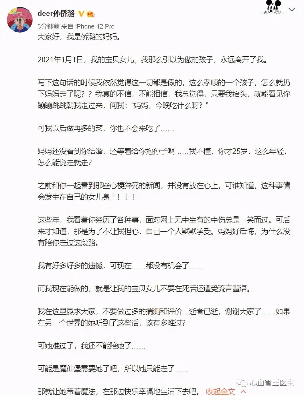 1月2日,孙侨潞母亲发文透露孙侨潞1月1日去世。文中透露“之前和你一起看到那些心梗猝死的新闻,并没有放在心上,谁知道这种事情发生在自己女儿身上。”