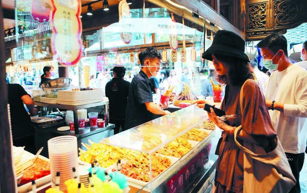 大运会将为成都美食带来重要的展示机会。图为游客在宽窄巷子品尝成都小吃Q:
