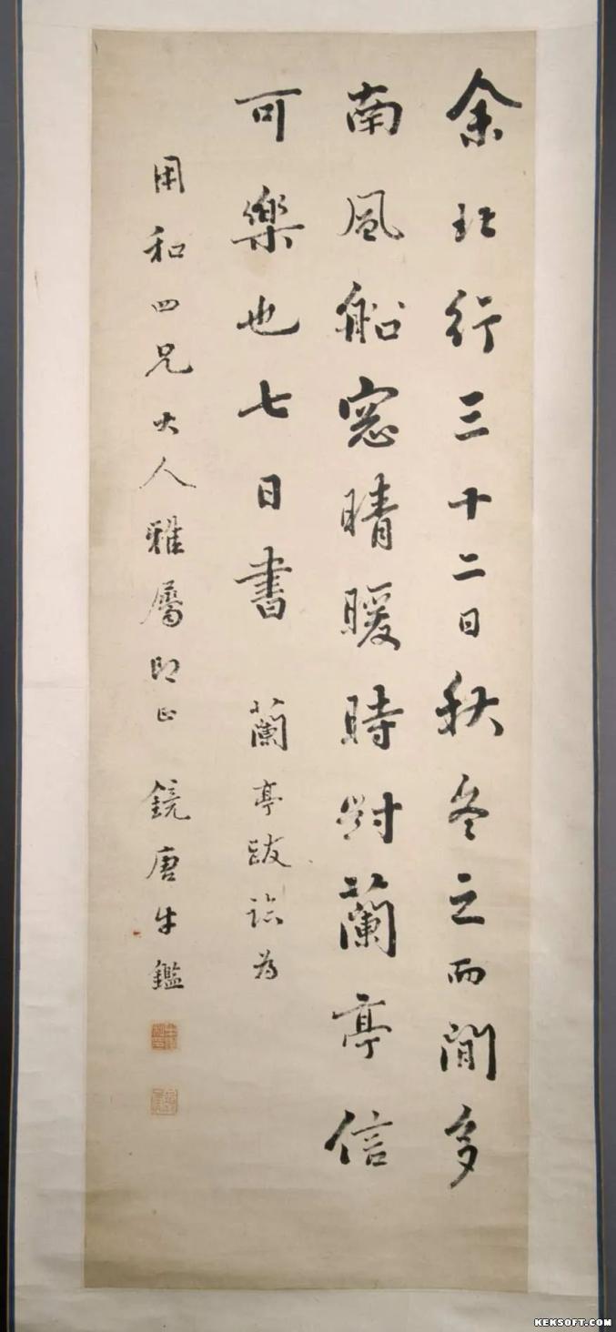 今天向大家分享的是清代书法,清牛鉴行书轴。作品为中堂,呈纸本,纸裱。行书体。内容“余北行三十二日 秋冬之而间多南风 船窗晴暖 时对兰亭 信可乐也 七日书”。落款为:“用和四兄大人雅嘱即正,镜堂牛鉴”。作品长:121厘米;宽42.8厘米,保存完整,为国家三级文物,现收藏于武威市博物馆。