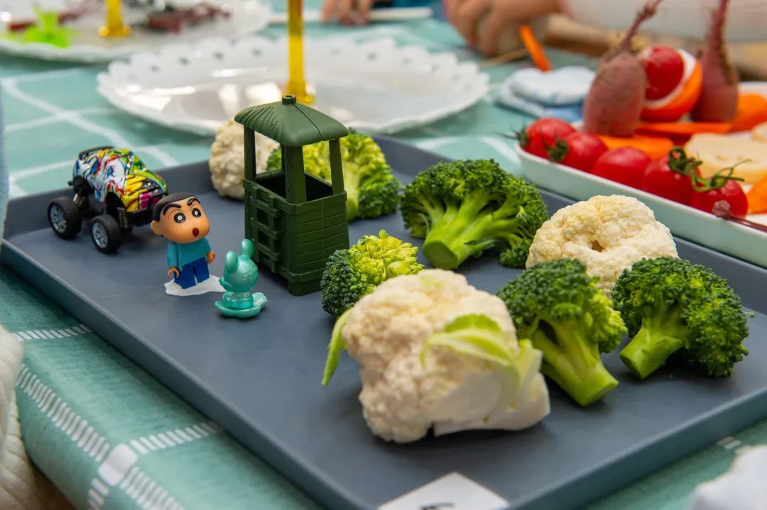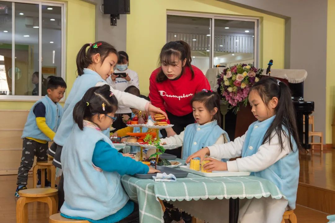 而在大班美术活动“食物艺术展”中,青年教师张蕾和孩子们一起,用生活中的小食材,玩出大不同。借鉴日本微观摄影师田中达也的作品,师生们用蔬菜、水果开展食物艺术创作:玉米和生姜是“山”、芒果是“沙滩”、橙子切开后就是“游泳池”……缤纷的色彩和多样的形状,激发孩子们的想象力,也让他们更好地理解了远近空间、颜色搭配。“这是我的菜叶‘瀑布’、花菜‘树屋’”,儿童视角的精彩创作和稚气介绍,不时引发现场阵阵笑声。