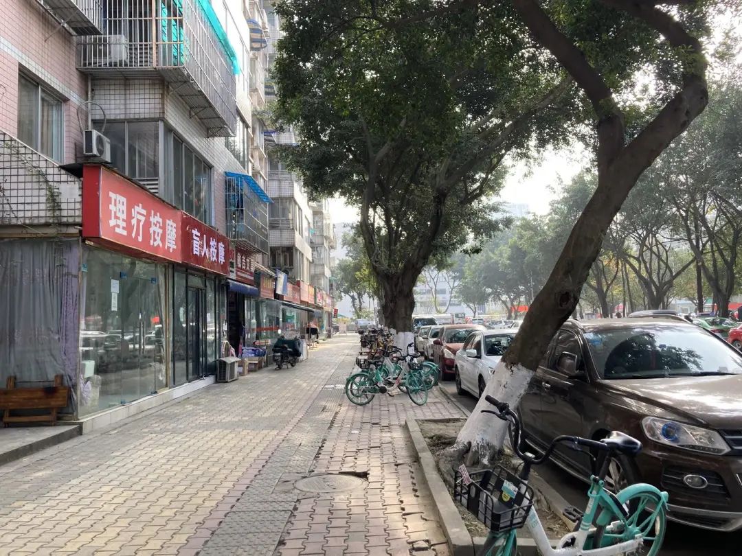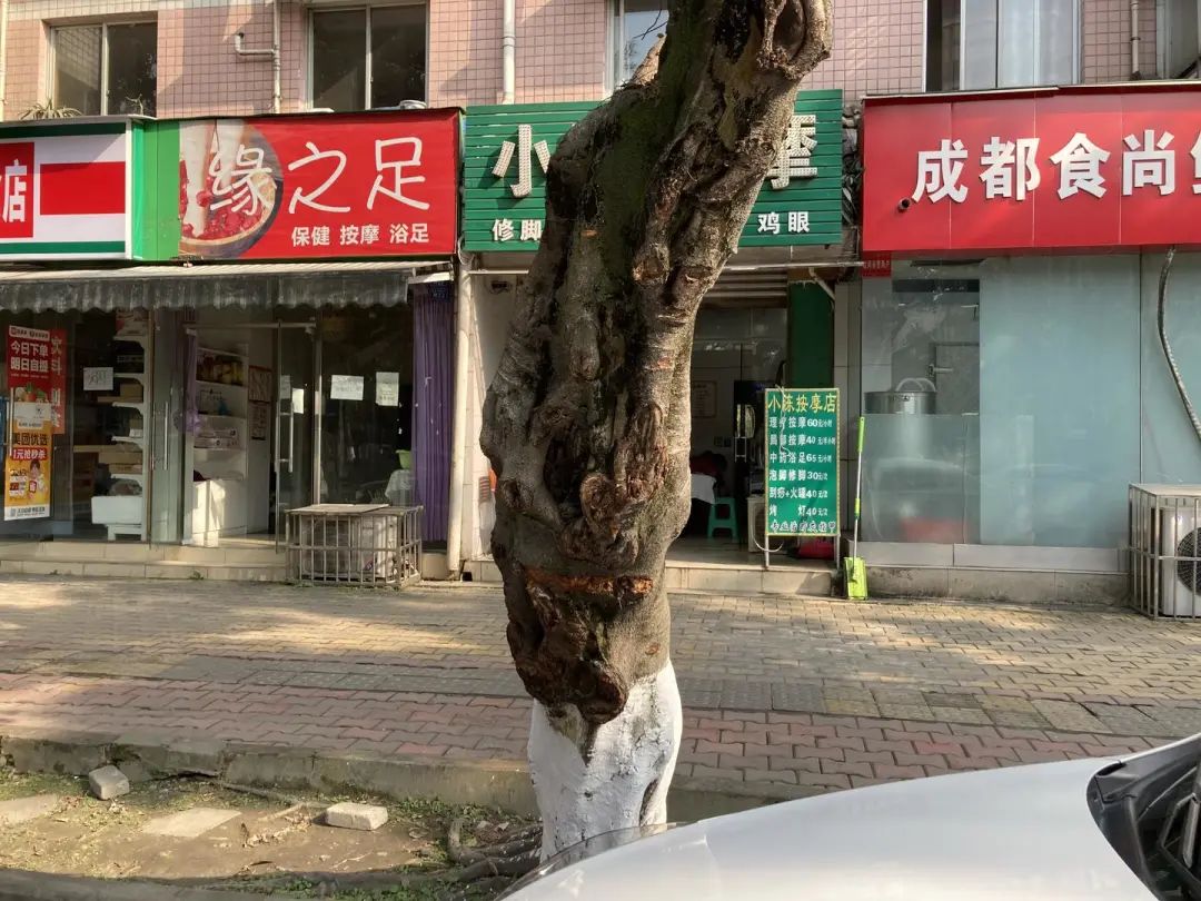 “有客人本来要按摩的,在门口倒车把玻璃撞烂了,只有赶紧去修车理赔,撞得严重的都要花几千块钱。”陈女士开的按摩店正对着这棵‘歪脖子’树,她表示,不管大车小车,尤其在倒车的时候,控制不好距离就容易撞在树上。