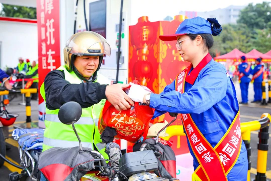 2020年“情暖驿站”活动现场▲自2013年起,中国石化开展“情暖驿站 满爱回家”公益活动,开始为“返乡摩骑”免费加油,至今已第9个年头。