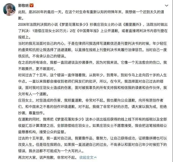 2020年12月31日,郭敬明在微博上发布公开道歉信。这已经是2006年的事情了,郭敬明的《梦里花落知多少》,抄袭了庄羽的《圈里圈外》。