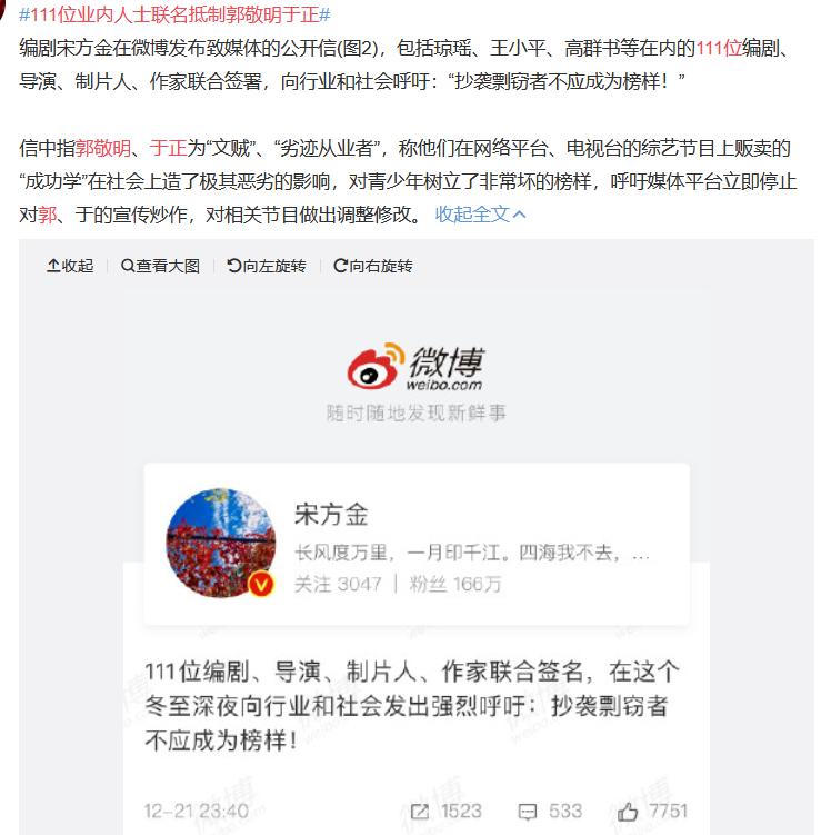 郭敬明作为某综艺节目评委,开始点评现在的影视圈,引发了111位影视从业者联名抵制,向行业和社会呼吁:“抄袭剽窃者不应成为榜样”。