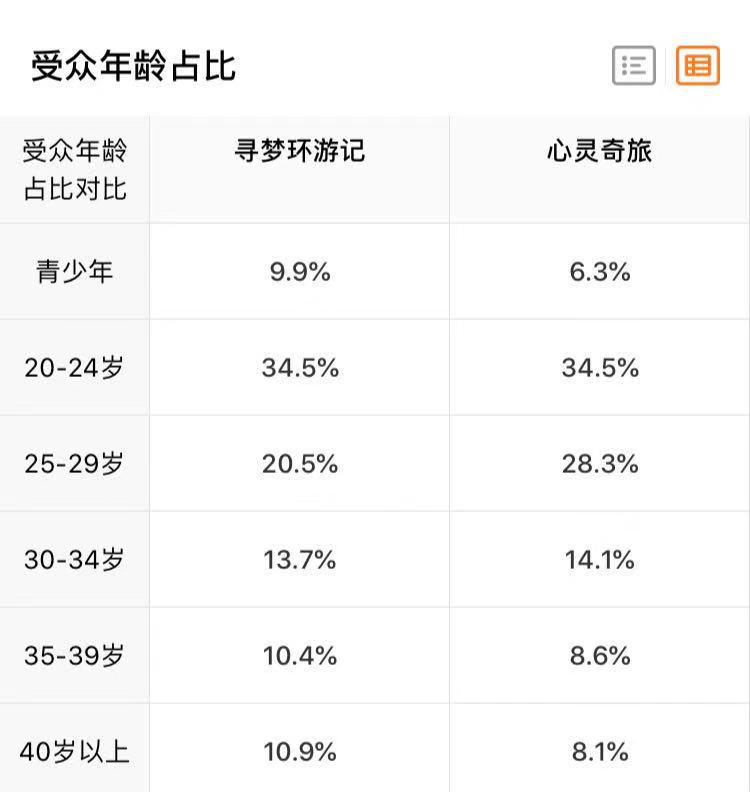 和《寻梦环游记》对比,也能发现一些受众年龄的微妙差异。最主力的“20-24岁”人群两部影片比例完全相同,但25-34岁年龄段《心灵奇旅》高出了8.2%,更受有一定阅历的成年人青睐。