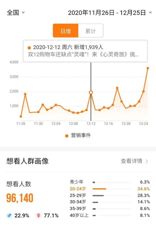 《寻梦环游记》毒眸(微信ID:DomoreDumou)在灯塔专业版的营销事件中发现,相比其它影片,《心灵奇旅》的营销动作并不频繁,也并未举办线下宣发活动,这或许对影片前期的排片造成了一定影响。不过究其根本,是影片本身的受众圈层相对偏窄限制了《心灵奇旅》的票房上限。