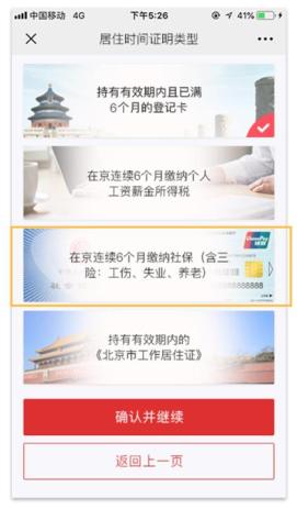 如果您在选择居住时间证明类型时,选择了在京连续6个月缴纳社保(含三险:工伤、失业、养老)作为时间证明,后台会自动进行数据比对进行核实并判断您是否符合条件。