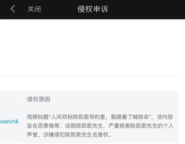 被投诉的UP主们晒出了侵权申诉截图,大部分申诉都是认为UP主们制作的视频“旨在恶意侮辱、诋毁陈凯歌先生,严重损害陈凯歌先生的个人名誉,涉嫌侵犯陈凯歌先生名誉权”。