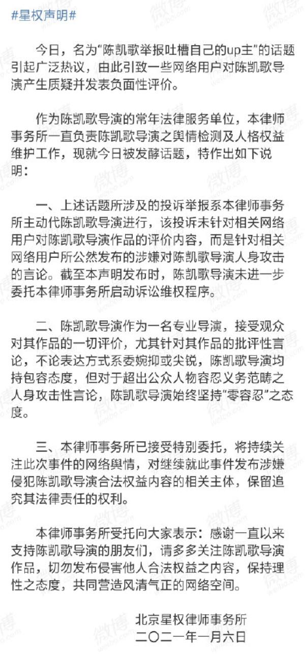 1月6日下午,陈凯歌的“常年法律服务单位”星权律师事务所发布声明表示,本次投诉行为未针对相关网络用户对陈凯歌导演作品的评价内容,而是针对相关网络用户“所公然发布的涉嫌对陈凯歌导演人身攻击的言论”。且“截至本声明发布时,陈凯歌导演未进一步委托本律师事务所启动诉讼维权程序”。声明中还提出,陈凯歌作为专业导演,接受观众一切对作品的评价,尤其是批评性的评价,“但对于超出公众人物容忍义务范畴之人身攻击性言论,陈凯歌导演始终坚持‘零容忍’之态度”。