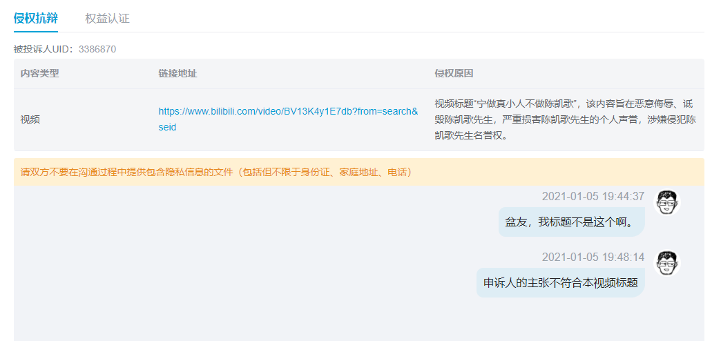 澎湃新闻记者采访了其中一位遭到陈凯歌方面投诉的UP主“郭云神奇”,对方认为现在的情况“等于是B站给了一个双方交流举证的机会”:“B站就类似淘宝小二,我现在的回复是:改了封面标题行不行?目前陈凯歌导演团队没回复,B站小二暂无应答。”