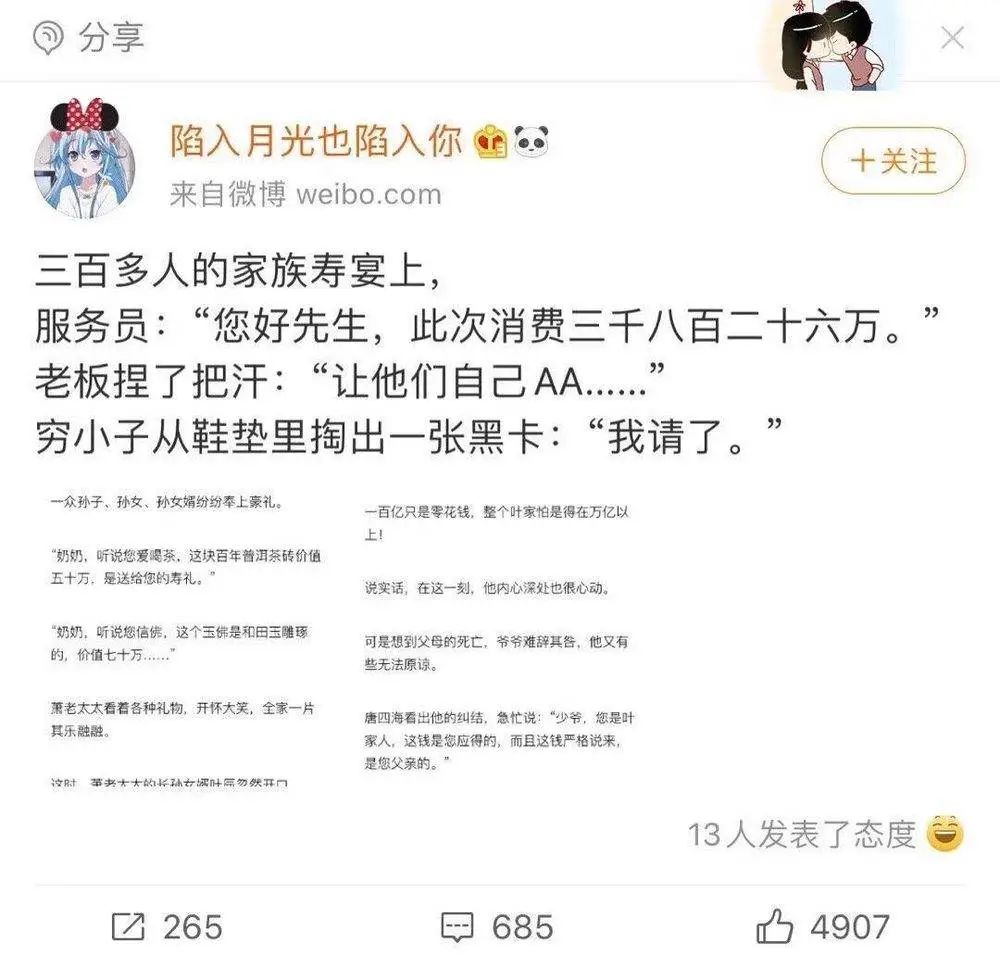 掉入坑中的读者们有的花了几个星期把一本百万字小说从头到尾看完一遍,被完美爱情暴击;有的觉得这小说实在一般,但来都来了,索性看完。有的因为男主性格问题非常生气,最终弃坑。总之,虽然表面鄙夷,但最终都真情实感地参与进这场文字盛宴。