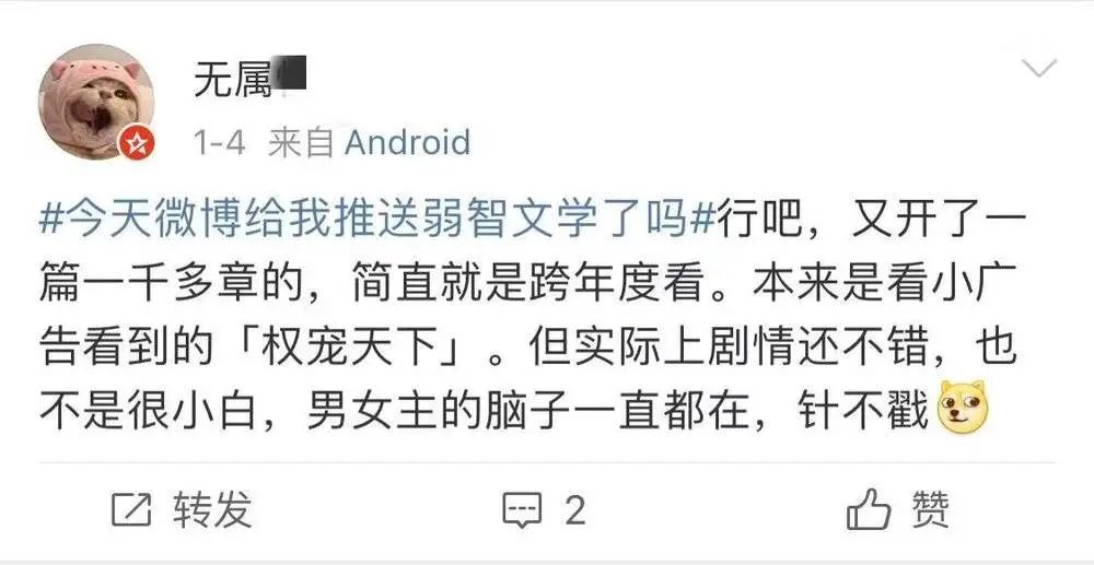 著名话题#今天微博给我推送弱智文学了吗#的讨论达到2.6万,阅读量高达4550万。但实际内容确实有点违背我们的预期。仔细一看,会发现很多掉入弱智文学坑中的人带着三分看不上,七分没想到讲述自己的心路历程。