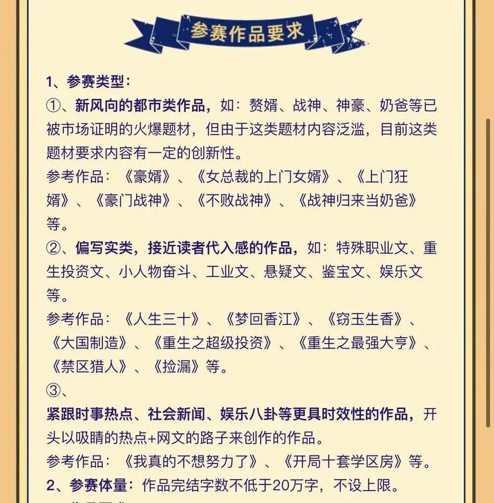随手点开一个网文平台的新媒体作品有奖征集的要求,就会快速发现它的套路:门槛低、选题类型集中、以“梗”而不是人物情节展开,最重要的是——面向下沉市场(非小说用户)的中年用户。