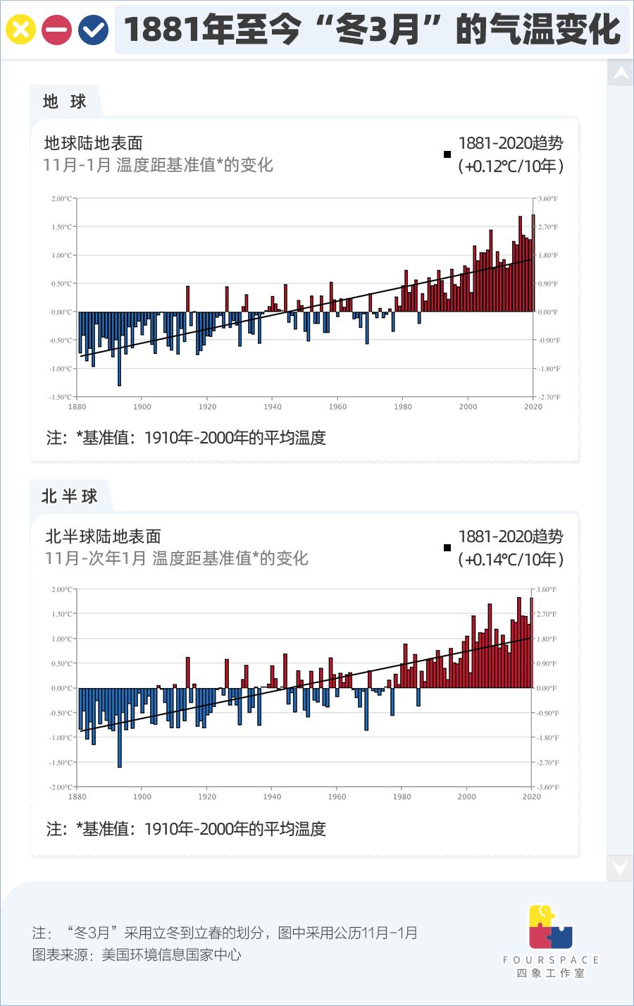 传统意义上,我们通常把“立冬”到“立春”之间的这段时间称为“冬天”,大致对应11月至次年1月。美国环境信息国家中心显示,自1881年以来,全球“冬三月”的陆地温度在逐渐升高,平均每10年升高0.12℃,100年约升高1.23℃,尤其是1980年之后,全球陆地温度从基准温度附近,一路“飙升”,2020年已高过基准温度1.72℃。(注:此处“基准温度”是指1910-2000年的平均温度)