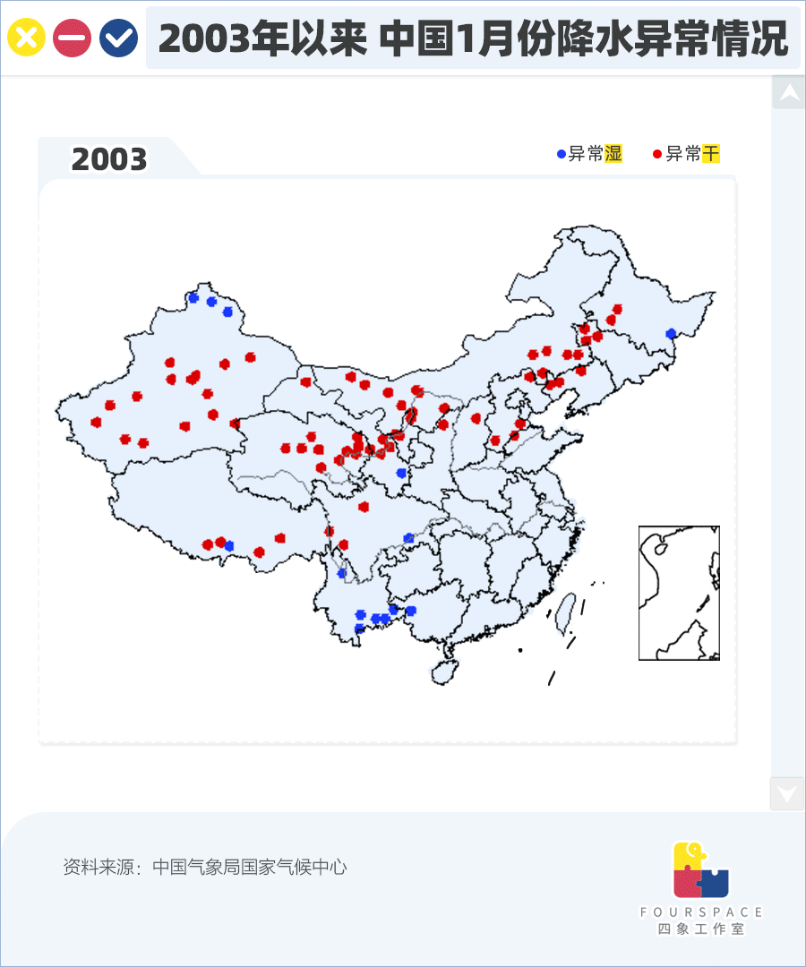 全球气候变化中还有重要的一环就是降水。与温度变化类似,降水变化也呈现出了一定的地域特征。研究者发现,作为冬季降水的主要区域,南方大多数地区冬季降水在近50余年间有上升趋势,且从西向东趋势逐渐增大。而我们从全国1月份降水异常状况可看出,近年“异常干”的区域则多集中在北方。