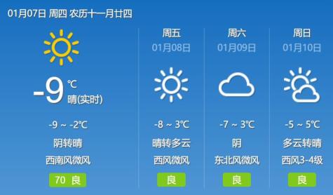 ▲今天(1月7日)早晨将出现本轮降温的最低温,大家出门一定要注意保暖。西安市气象台1月6日16时发布天气预报:受较强冷空气影响,预计7日白天西安市有降温、吹风天气。具体预报如下:7日白天:阴天转多云,气温-9℃~-2℃,有3~4级偏北风,阵风5级左右;8日晴间多云,气温-8℃~3℃;9日多云间阴天,气温-7℃~3℃。