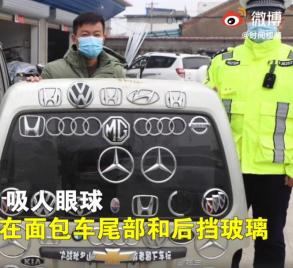 ▲1月4日,安徽阜阳。某修理厂员工张某某多年来积攒了一些报废车辆车标。为标新立异,吸人眼球,张某某将四十余枚车标粘在面包车尾部和后挡玻璃,还贴上“决战秋名山,败者留下车标”的标语。被人举报后,因机动车违法喷涂、张贴标识或者车身广告,张某某被民警批评教育并处以200元罚款。